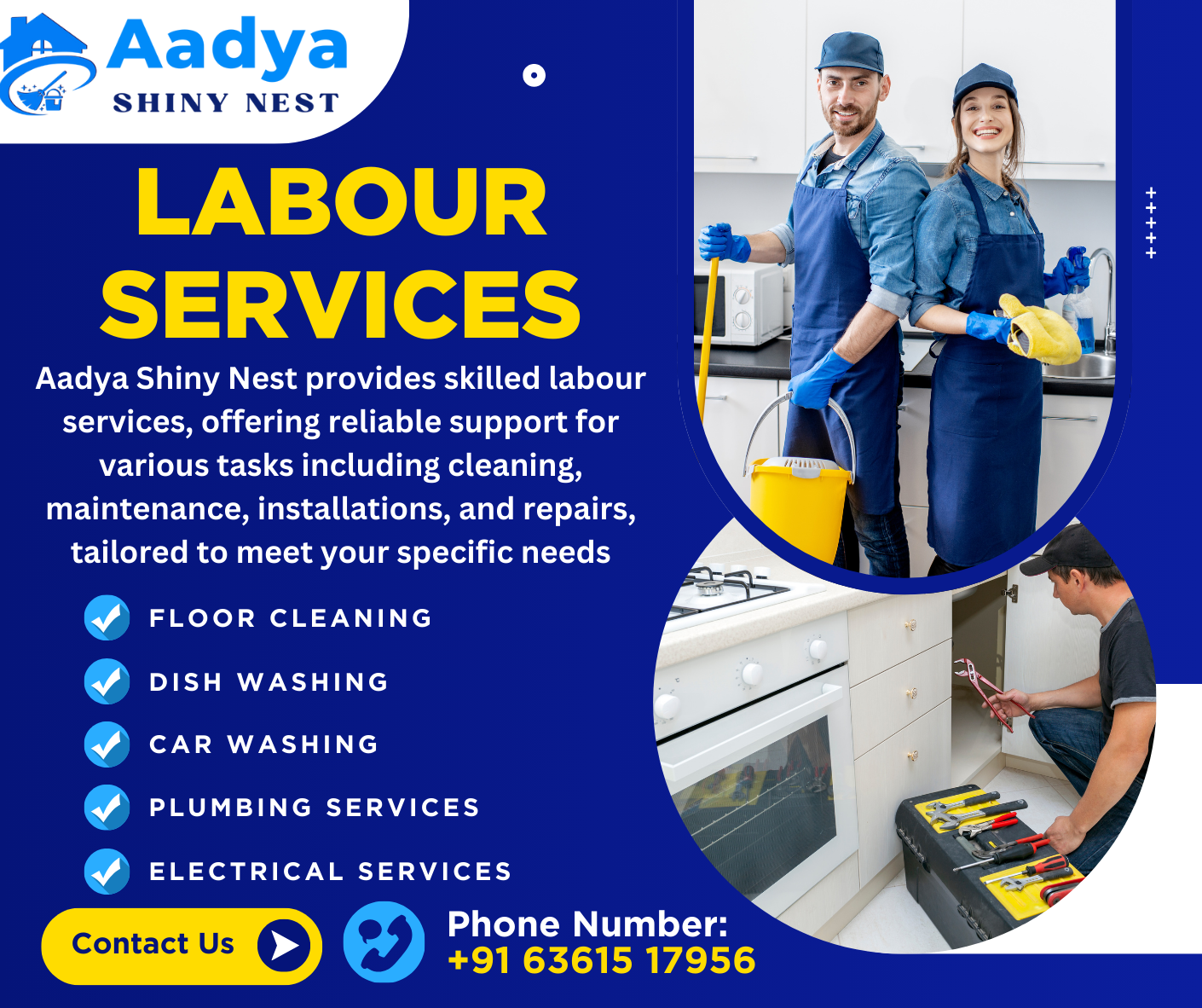 Aadya Shiny Nest offers a wide range of services including plumbing, electrical, cleaning, car washing, dishwashing, floor cleaning, and skilled labor support for both residential and commercial needs.